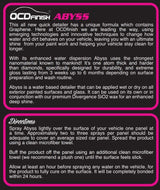 OCDfinish Abyss is an all new quick detailer with a unique formula which contains graphene. With it’s enhanced water dispersion Abyss uses the strongest nonmaterial know to man. One atom think and harder than diamonds, specifically designed for durability, and extreme gloss lasting from 3 weeks up to 6 months depending on surface preparation and wash routine.